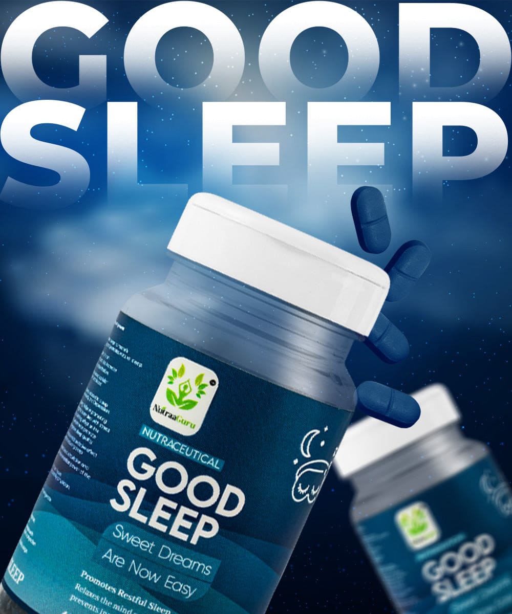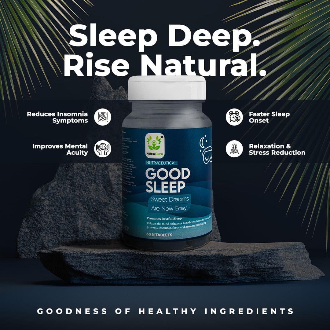 Good Sleep is your companion for restful nights and better well-being. Each bottle includes 60 tablets with natural ingredients like Jatamansi for mood, Brahmi for alertness, and Tagar for better sleep.